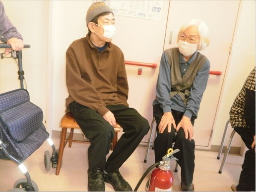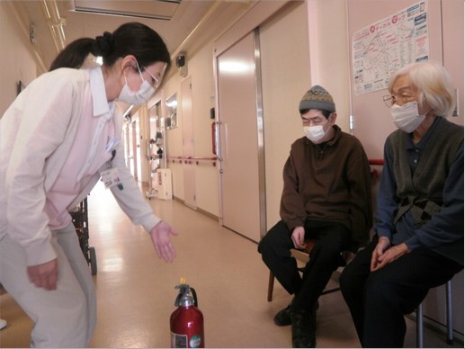 2月には消防避難訓練がありました。冬の避難訓練は寒いので建物内で設備点検担当者様から説明をして頂きました。