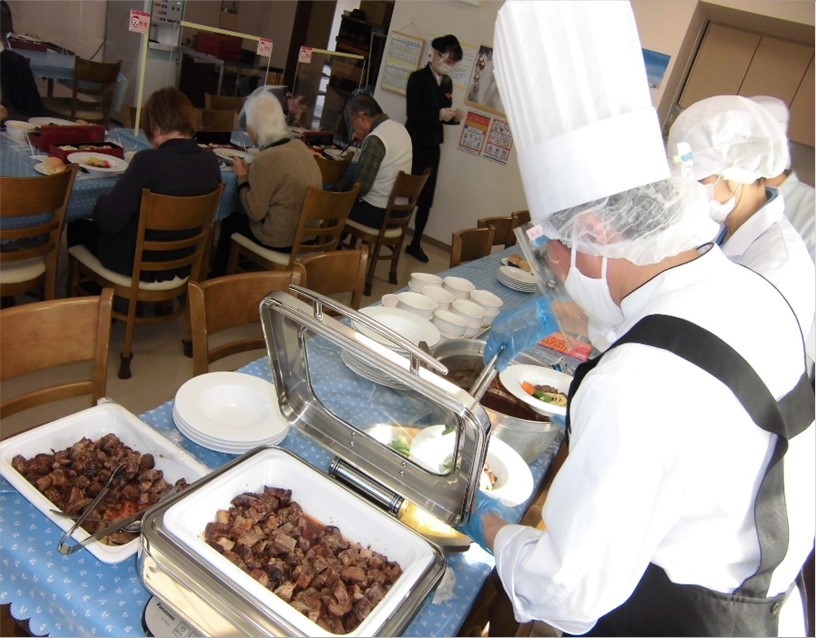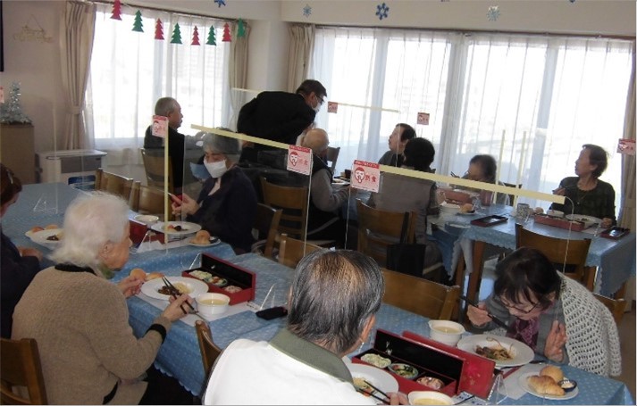 クリスマスソングが流れるラウンジでお友達とお召し上がる方。ご家族と共にお部屋でゆっくりお食事を楽しむ方。様々な形で楽しまれました。
