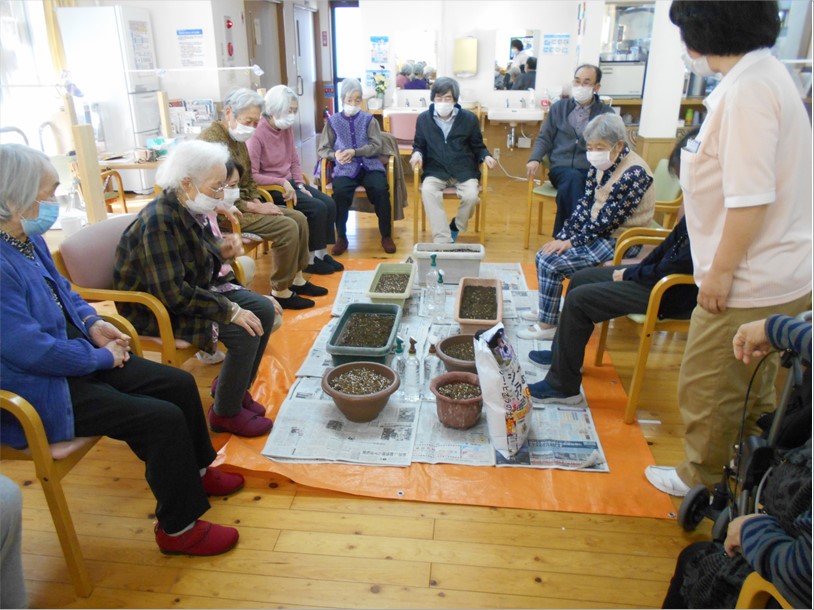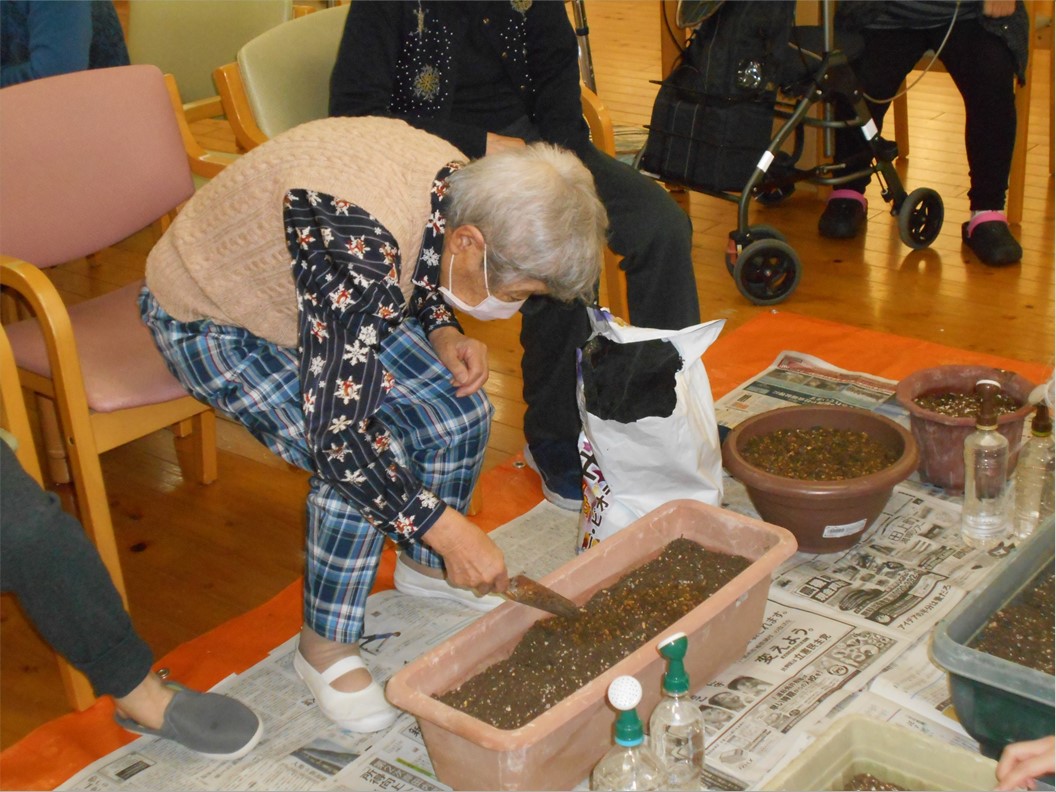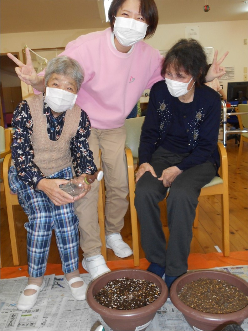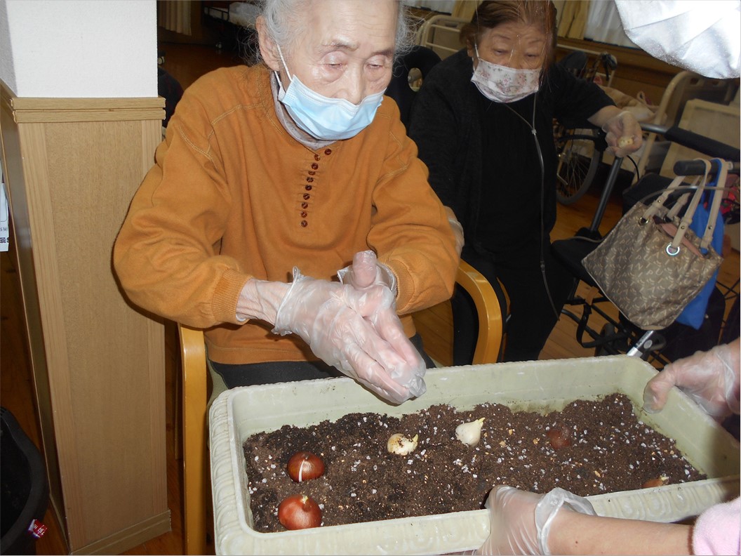 「デイサービスセンター松明」では、11月25日(木)・26日(金)・27日(土)の3日間にわたりチューリップの球根をご利用者様と一緒にプランターに植えました。