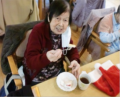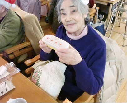 演目後はビンゴ大会を行い、マスクや防寒具などスタッフ厳選の商品をプレゼントさせて頂き、クリスマス会・ビンゴ大会と盛り上がりをみせた後は、ケーキを食べて笑顔いっぱいで閉幕です。