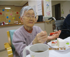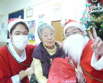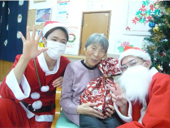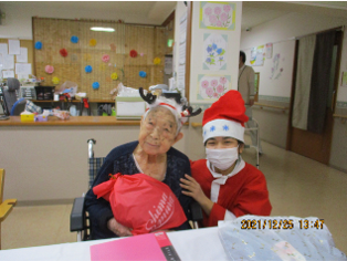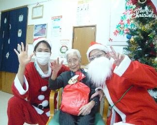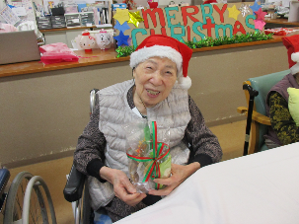 104歳のご入居者様も笑顔で参加!プレゼントを開けて、「あったかいね」「嬉しい」と笑顔で話されてました!(^^)!
