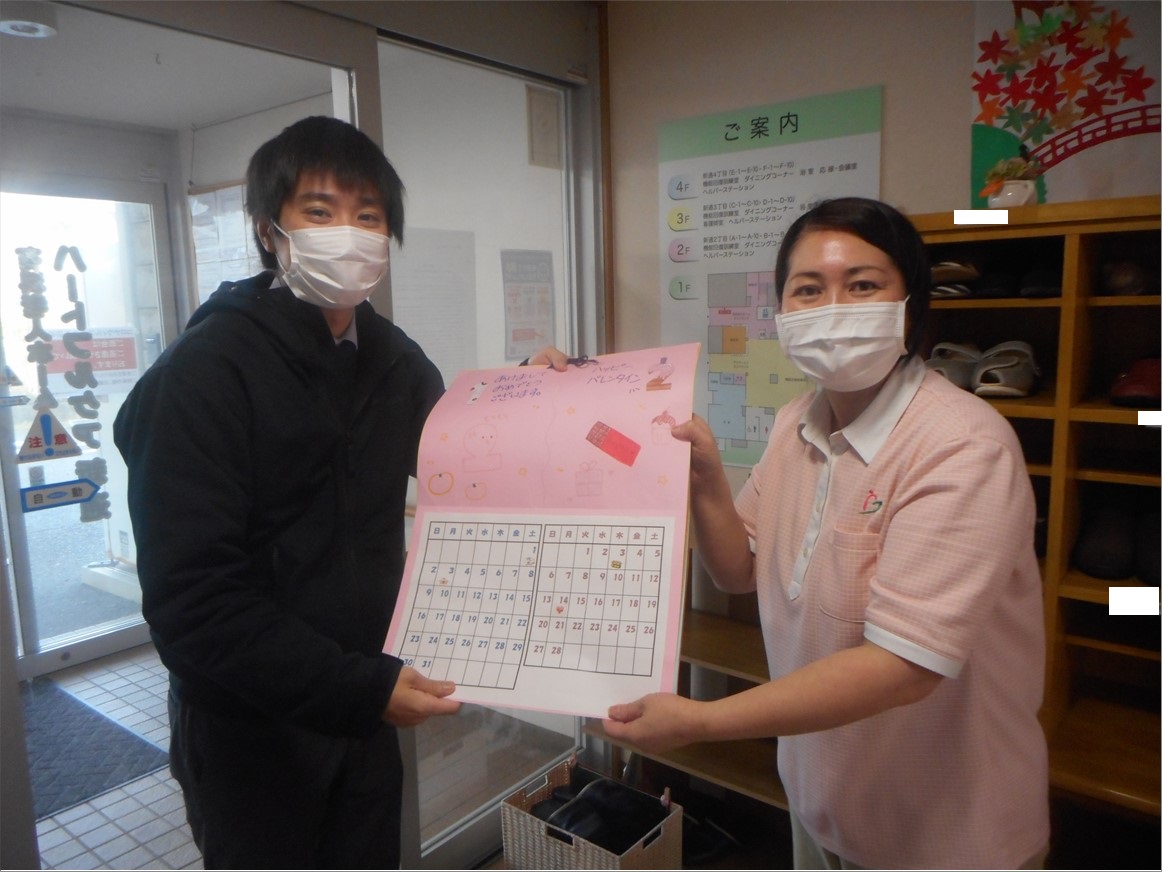 それでも学校側のご厚意で、ご入居者様に手作りカレンダーと、手作りのクリスマスツリーの作成キットを頂きました。