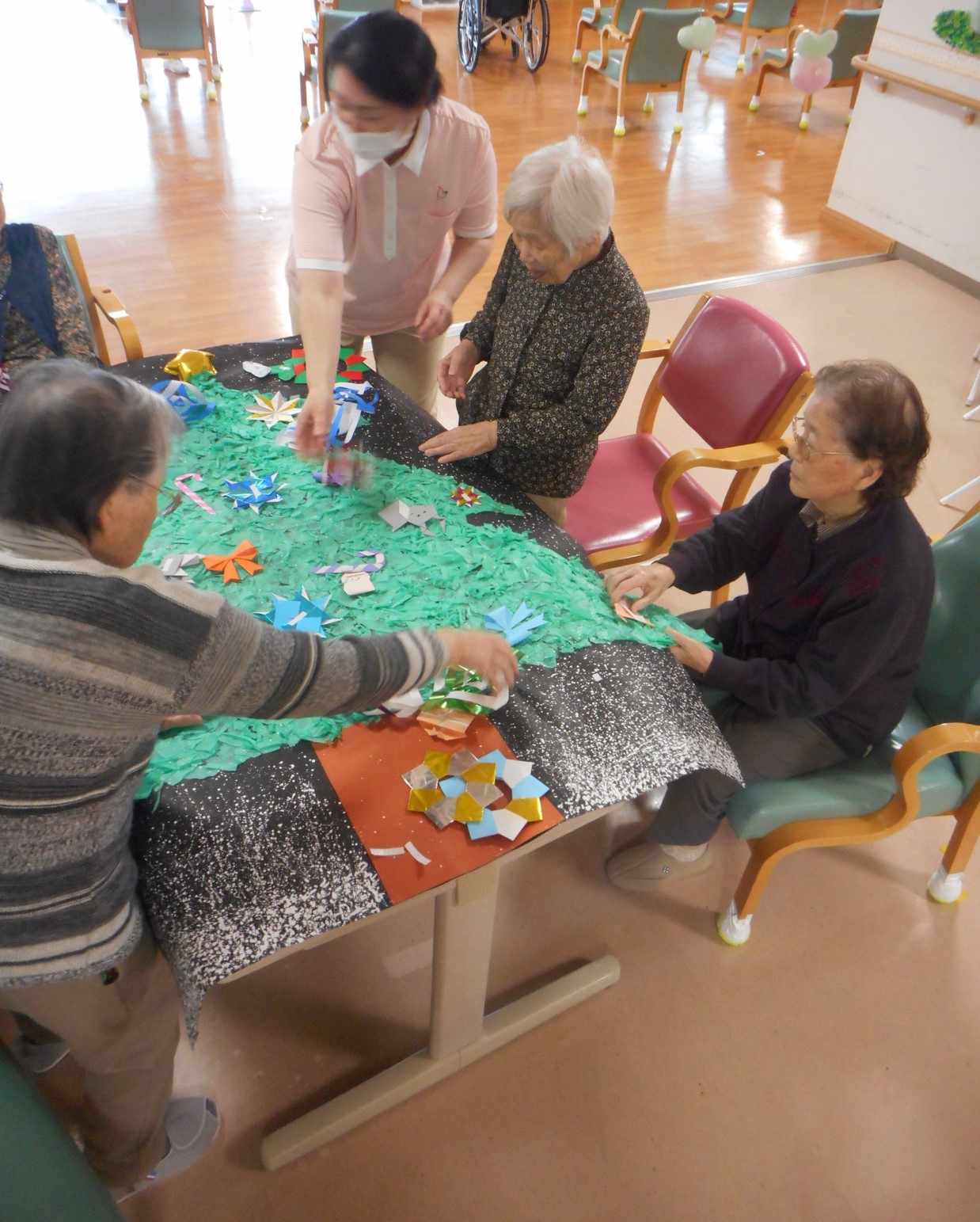 ツリーの台紙を囲み、ご入居者様も楽しんでペタペタ♬ 🎄 ♬ 🎄