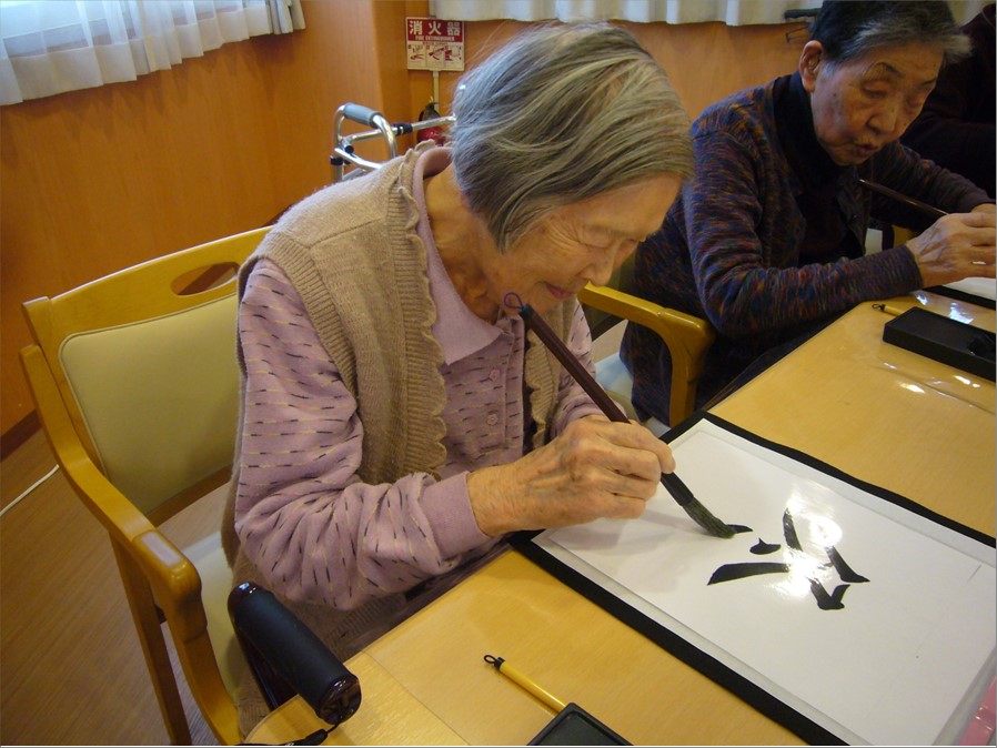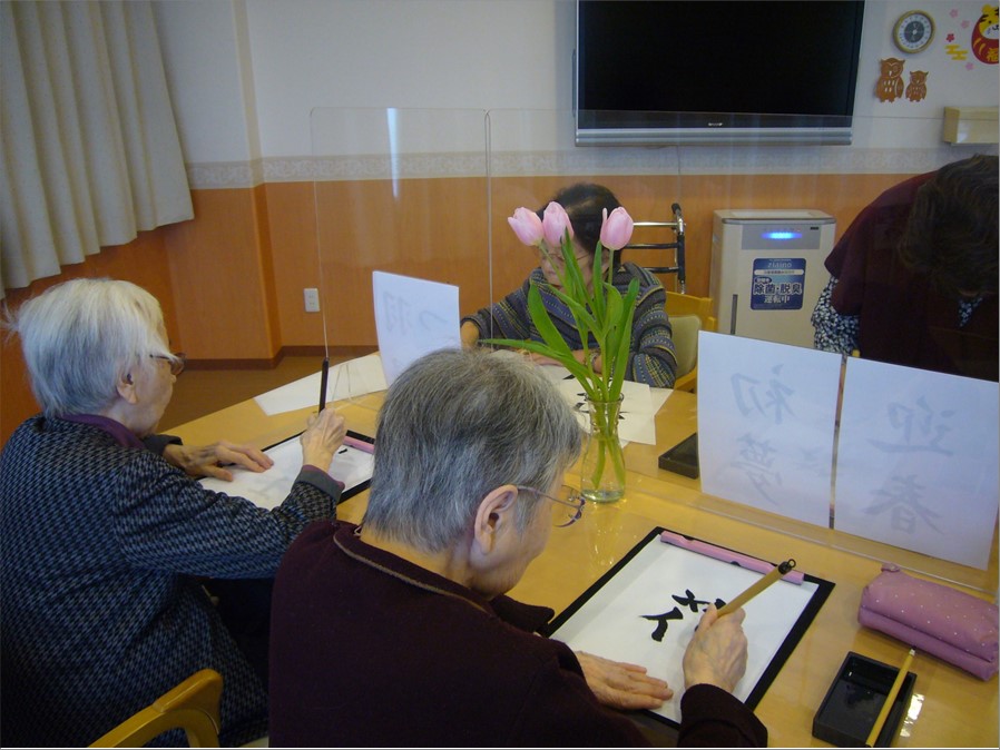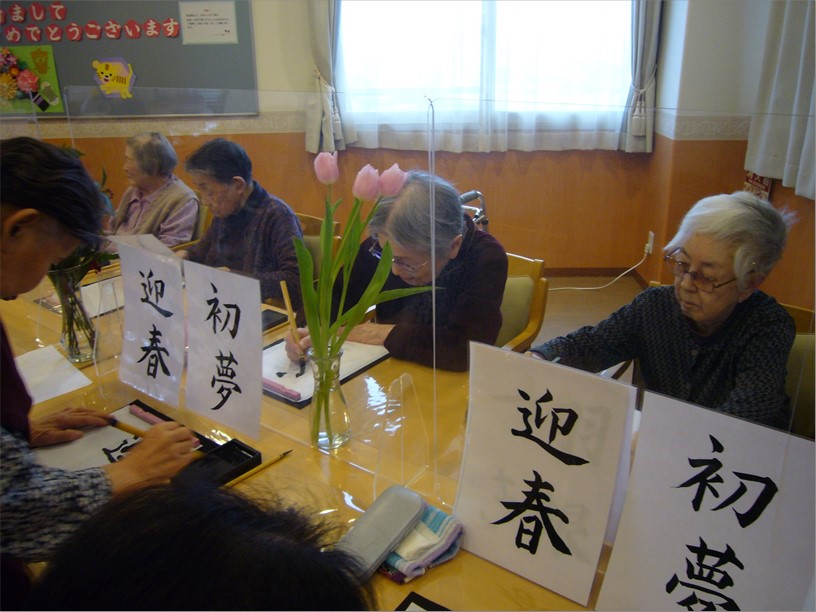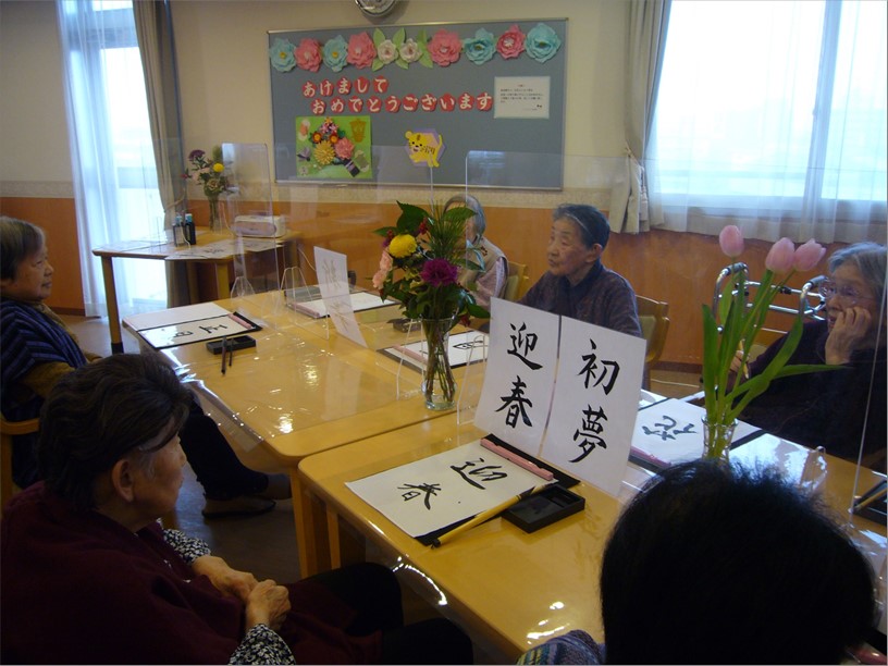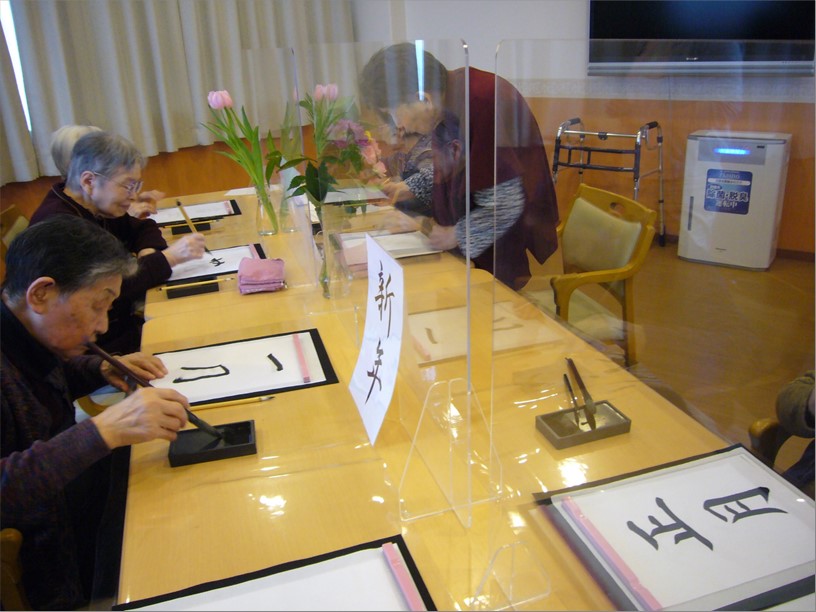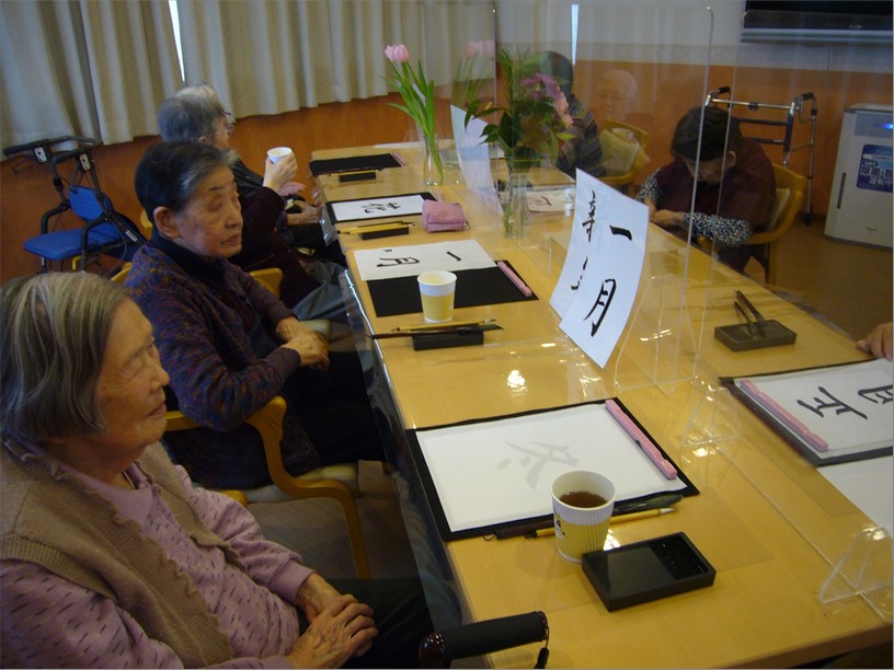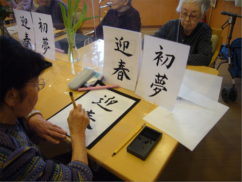 1月3日(月)の午後、『住宅型有料老人ホーム ハートフルヴィラ出来島』では、新年恒例の「書初め会」を開催しました。