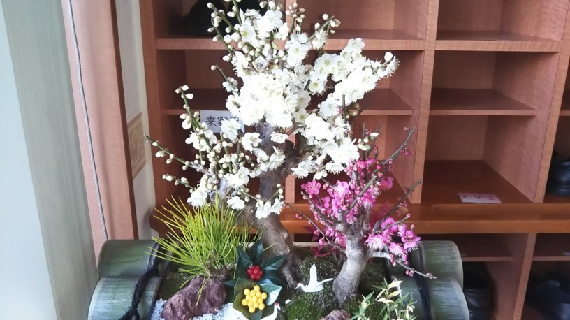 『リーシェ安行』、毎年おなじみのお正月玄関飾の「梅」も、満開になりました。