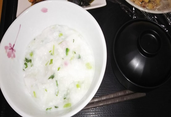 前日から準備してくれた色合いもきれいなお粥、胃にやさしそうです。皆さん完食!