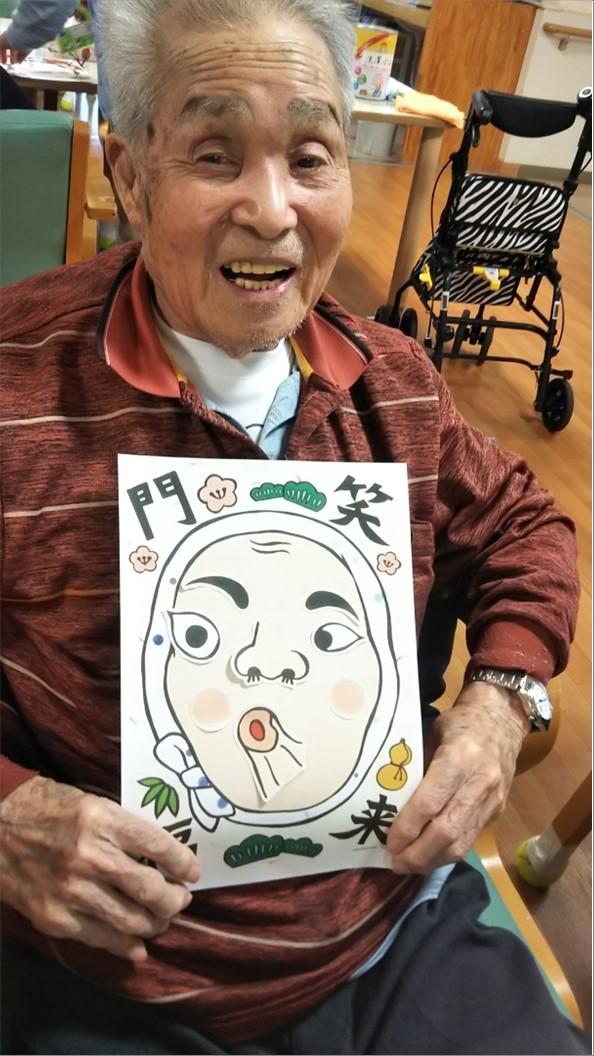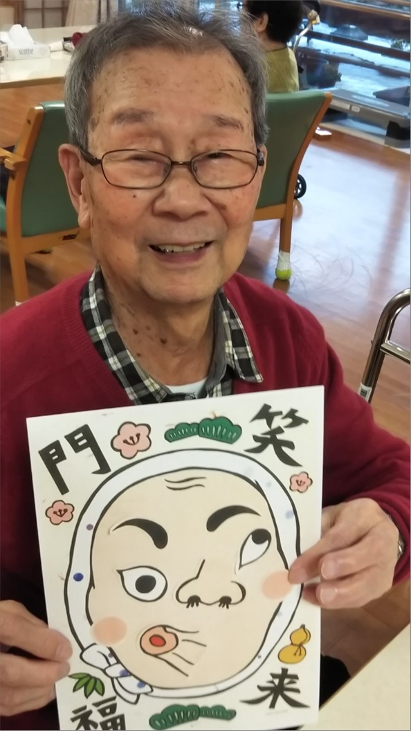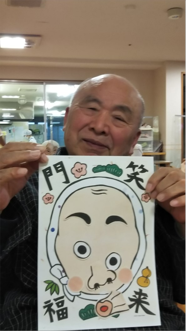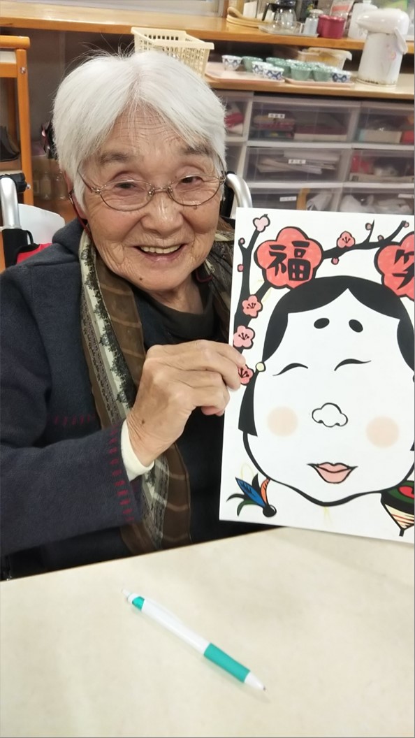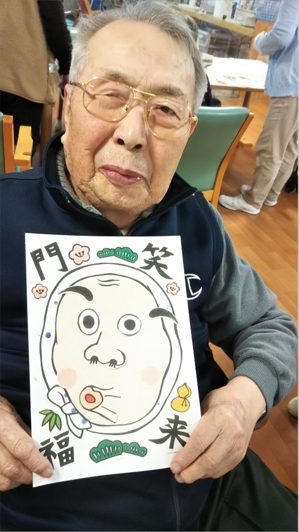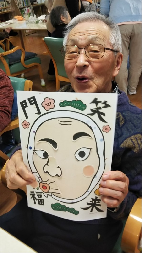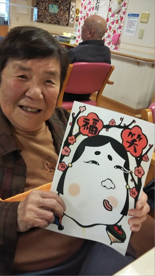 男性はひょっとこ、女性はおかめのに挑戦、お正月ならではの福笑いをしました。