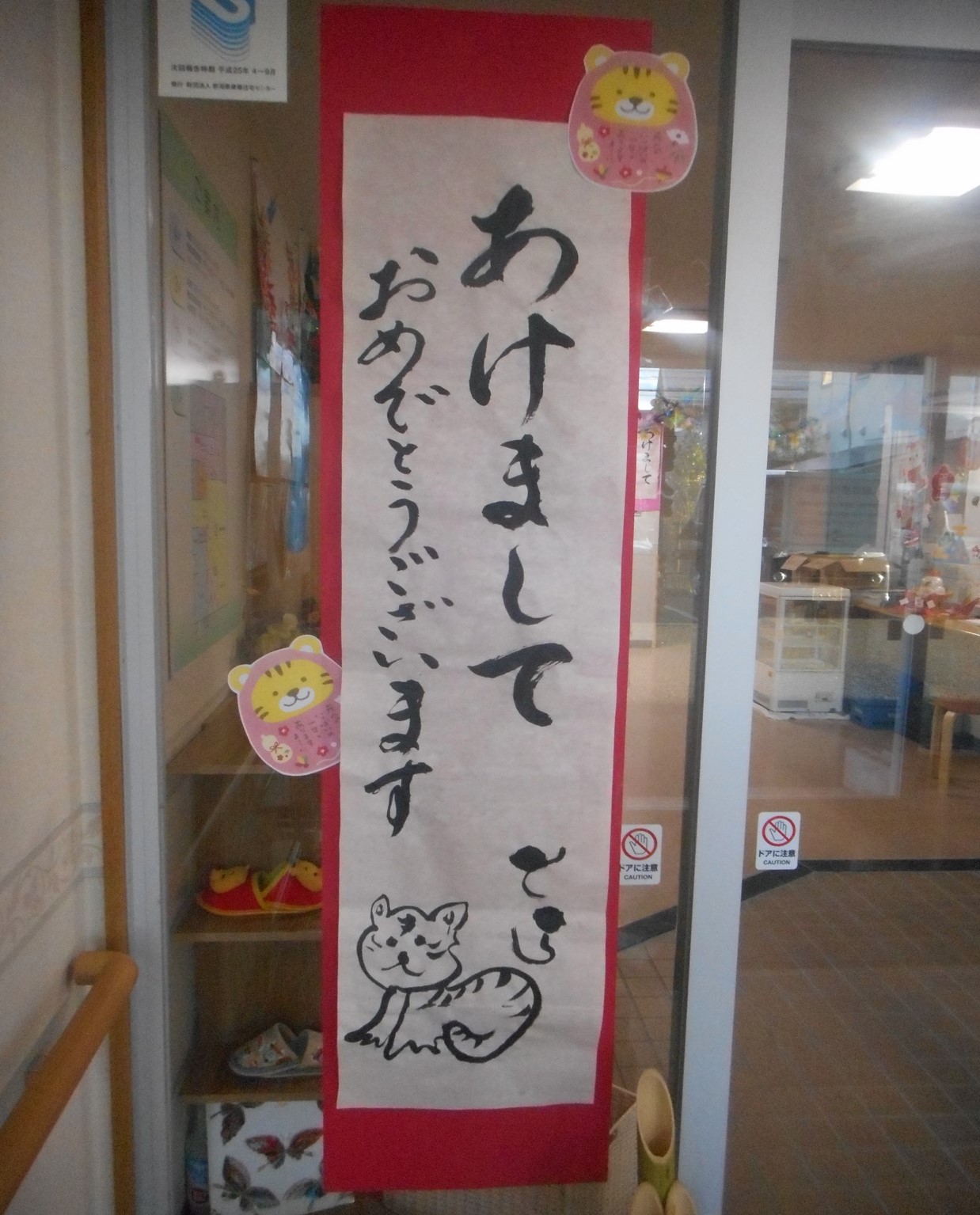 施設の入り口には、コロナウィルスが流行する前、ボランティアで来て頂いていた習字の先生から書いていただいた賀詞が飾ってあります。