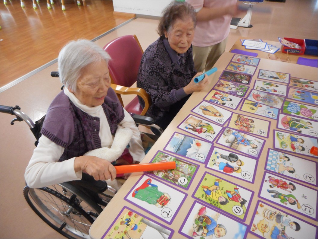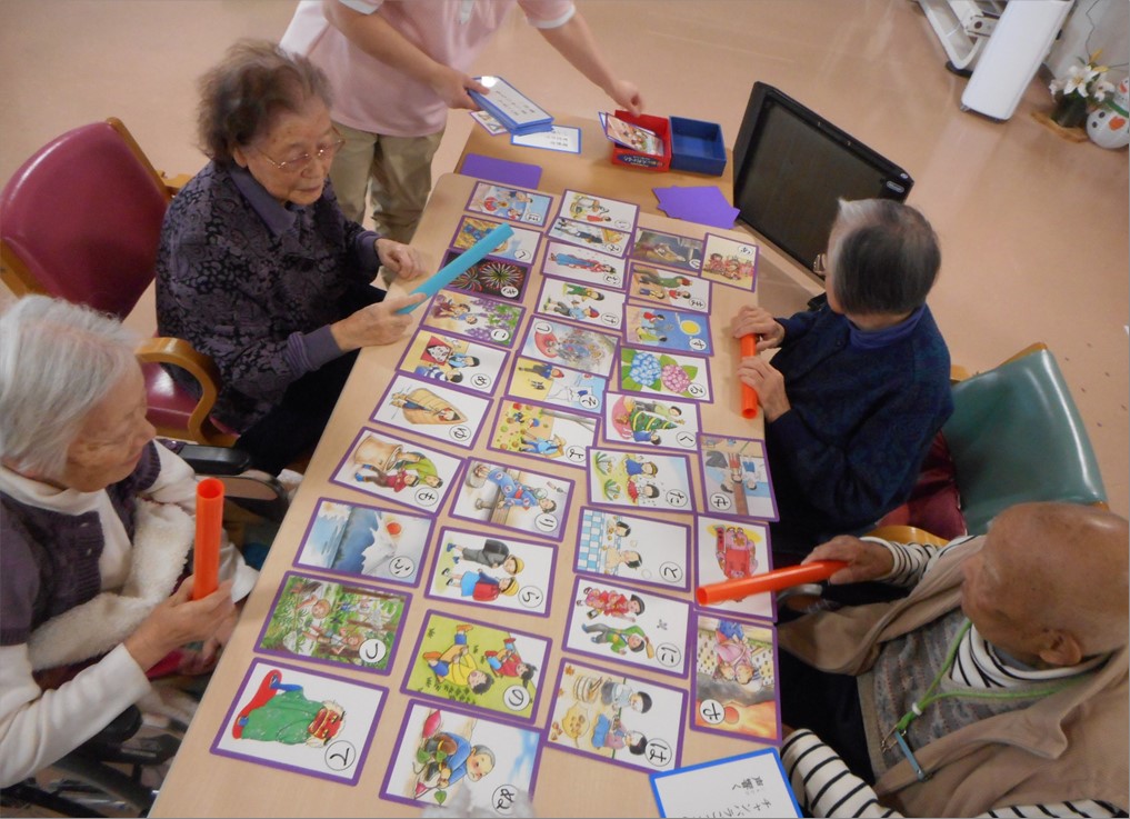 イラストを見ながら、「かわいいわね」「羽根つきしたわよ」等、ご入居様同士でお話も弾まれてました。
