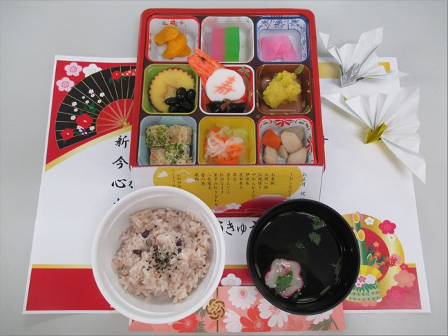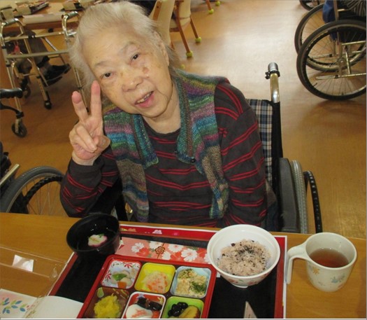 昼食は<お正月お祝い御膳>お赤飯の他に9品の色とりどりのお料理を美味しくいただきました。