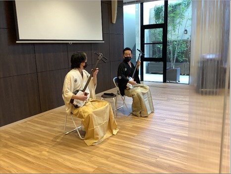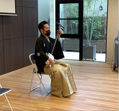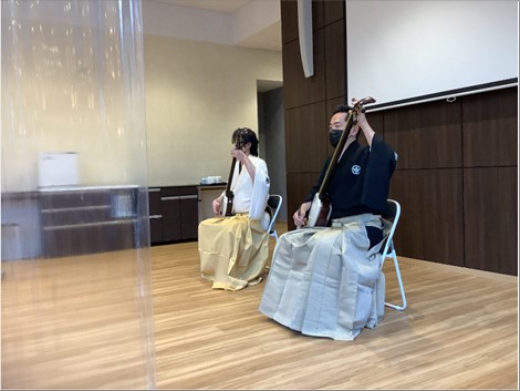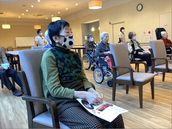 津軽三味線の曲はもちろん、聞き馴染みのある童謡を三味線Verでの演奏、速弾き等盛り上がる場面も多くあり、楽しんでおられ、中には三味線を弾いている様子を真似してるご入居者様もいらっしゃり、ほっこりする場面もありました。