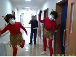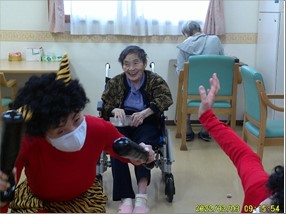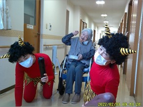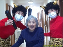 「鬼は外 ! 鬼は外 !!」赤鬼はご入居様に豆を投げられて、リビング・居室・廊下などを逃げ回り撤退しました。