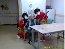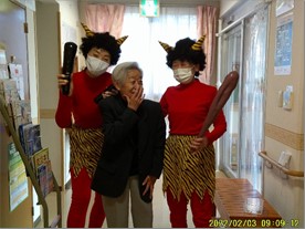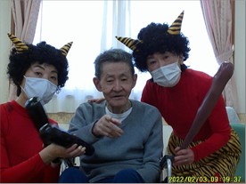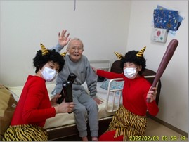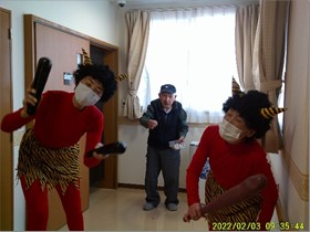 『リーシェ安行』では、毎年恒例となっている、鬼さん参加の豆まきを、デイサービスに出かける前に行いました。