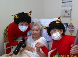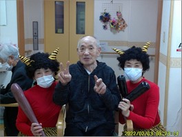 ご入居者様と赤鬼は、実は仲良しです!! 豆まきを終えた後は笑顔で記念撮影をし、お互いの健闘を称えました。