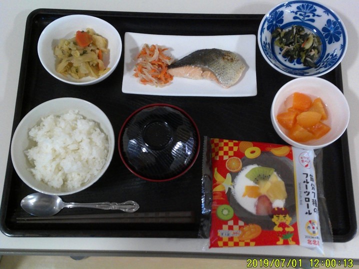 恵方巻はお出しできませんでしたが、昼食時に「フルーツロールケーキ」を召し上がっていただきました。