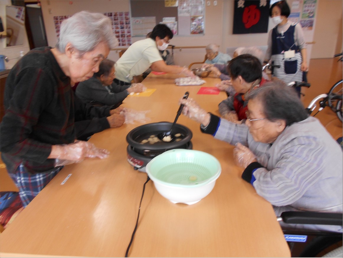 ご入居の皆様のご意見をお聞きして、ケーキやパフェ作り、たこ焼き作りなど多彩ですが、今回の調理は、皆様で力を合わせての「白玉ぜんざい作り」です!