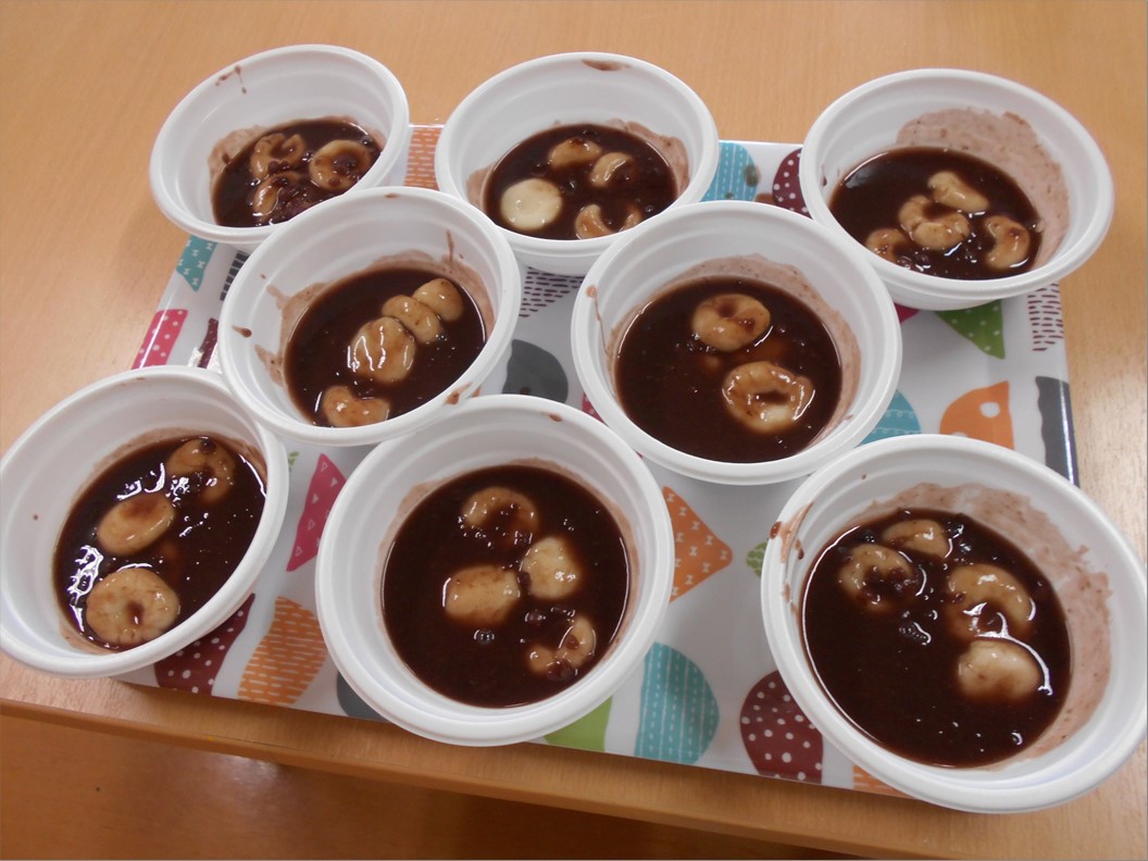 さすが手慣れたお玉さばき。ご覧のように美味しそうな「白玉ぜんざい」が完成しました!!