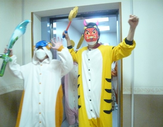 各階の職員と技能実習生、総勢8名が鬼になり、各階を練り歩き、1階から4階まで、ご入居者様が紙玉をもって待っているところに鬼が向かいます。