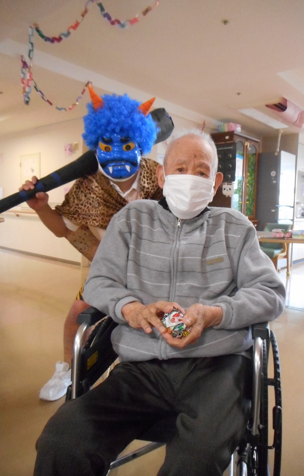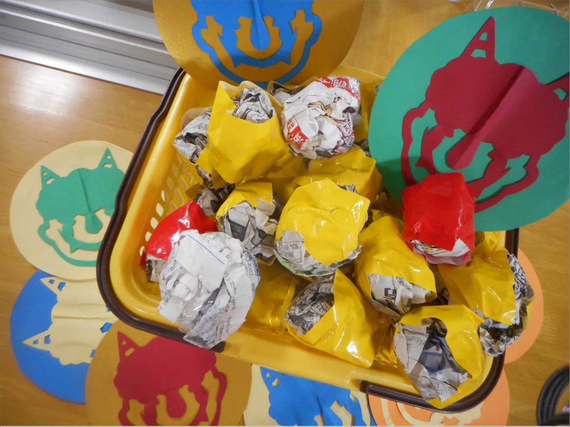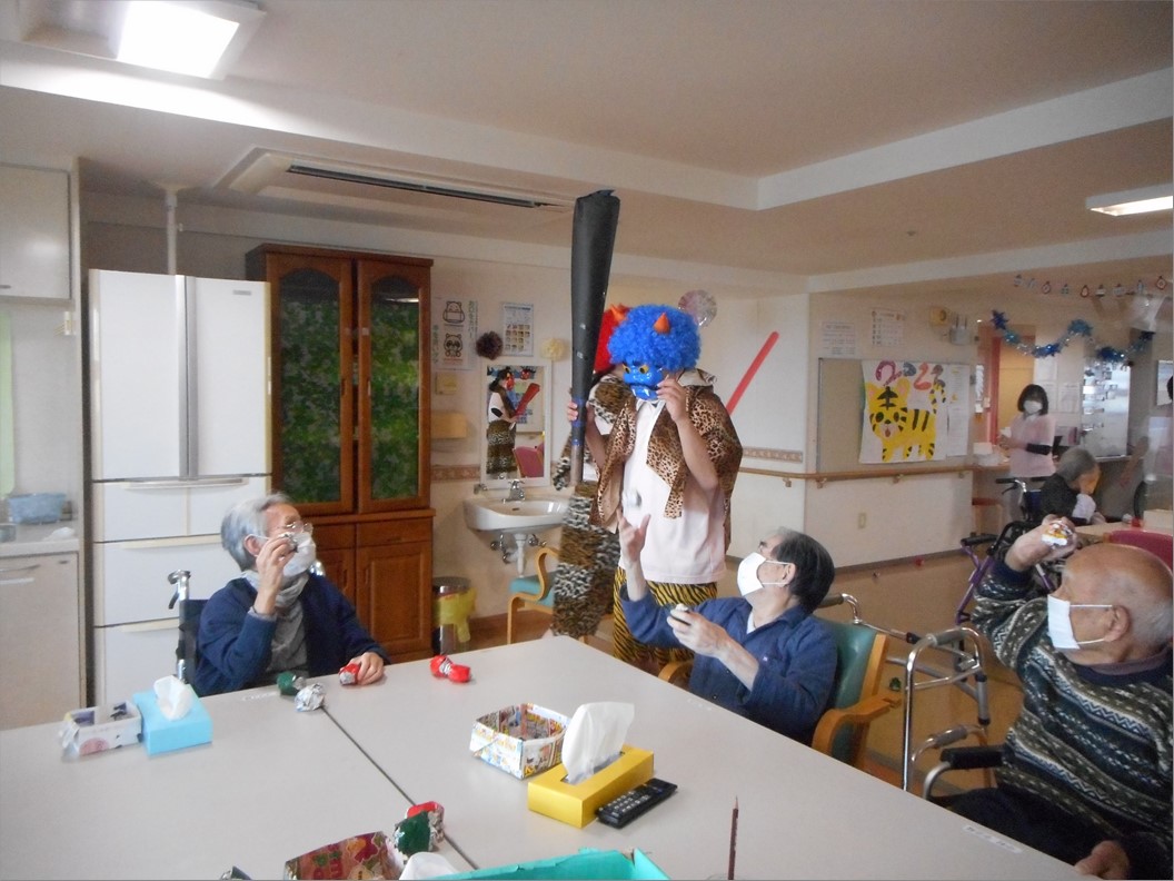 施設では、入居者様に豆の代わりに新聞紙を丸めたものを鬼めがけて投げて頂きます。