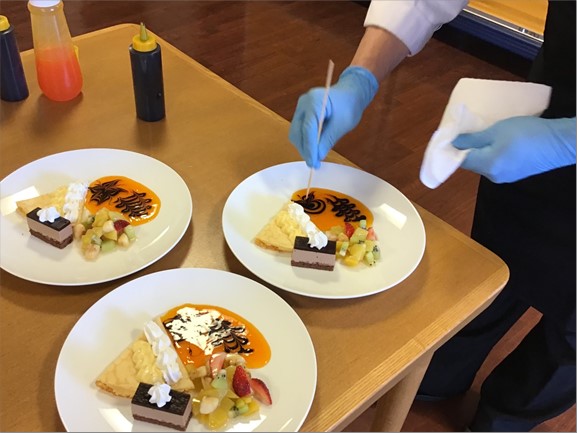 そしてそして、仕上げにソースでデコレーション。オレンジソースの上にチョコレートソースを載せます。
