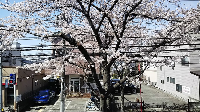 まずは、玄関前から見上げた桜、施設前の大泉学園通りの桜
