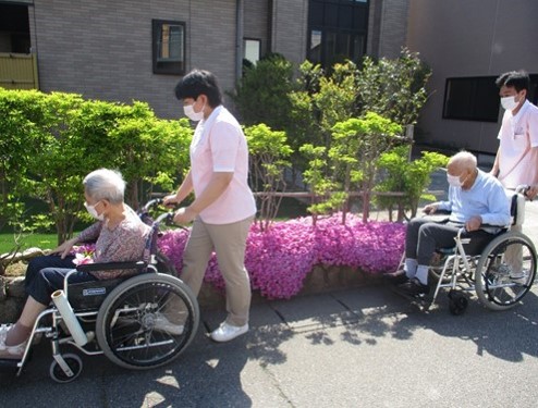 五月晴れの青空の中、皆様笑顔で技能実習生と一緒に施設周辺の散歩を楽しまれました。