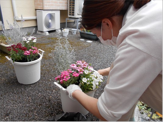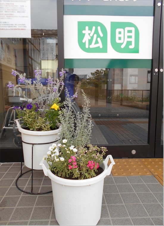 『デイサービスセンター松明』でも、季節の花々で皆様をお出迎えしようと、事務員が寄せ植えを造ってくれています。