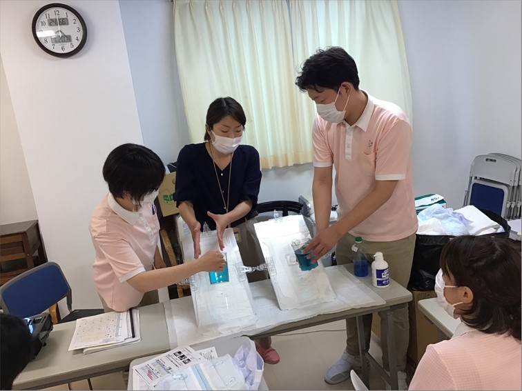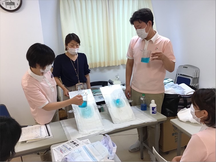 6月は、ユニ・チャームさんに来ていただく機会がありましたので、オムツ・パッドの適切な当て方、正しい使い方を学びました。