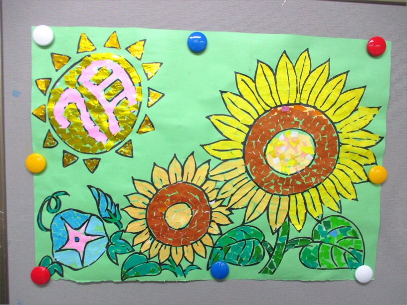 後に今月の貼り絵を紹介いたします。七月は太陽に向かって元気に咲く向日葵と朝顔です♪