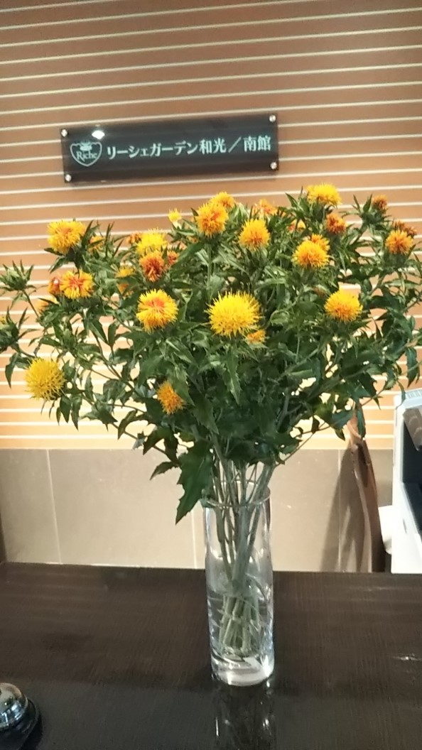 『リーシェガーデン和光/南館』のフロントデスクには山形県直送の紅花が飾られ、皆様に楽しんでいただいています。