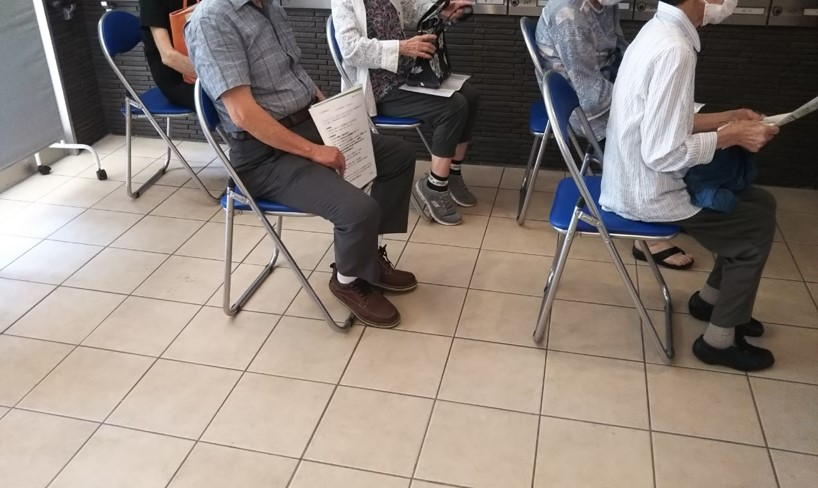 その日は大変暑かったので、暑さ対策として空調の効いている1階ロビーで接種を行いました。