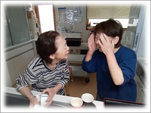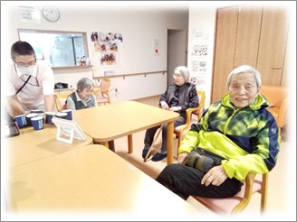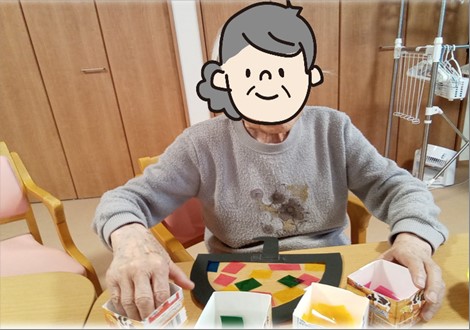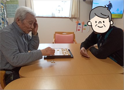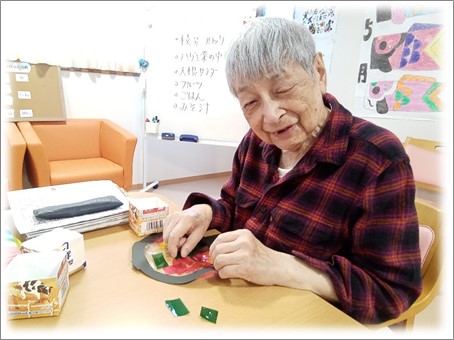 窓際に飾る傘のステンドグラスを作成したり、将棋をされたり。階は違えど趣味や話の合う入居者様は、職員が付き添い階を移動し、交流頂いております。