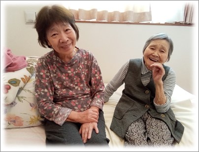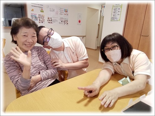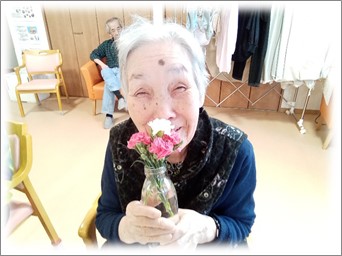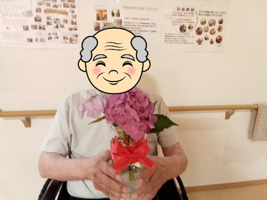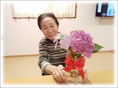皆様の日常のご様子です。職員が持参してくれたアジサイを花瓶に生けて頂き、記念撮影!ラウンジに来られた皆様からは口々に「綺麗だねぇ」と喜んで頂けました。