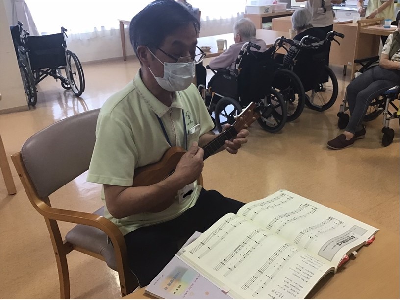 職員の中には、ウクレレ・ベース・ピアノを趣味で演奏されてる方もいます。 近々【音楽祭】を開催したいと思っております。その練習姿です。