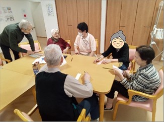 「なにを書こうかな。」「急になかなか決められないな。」「好きな事を書けばいいのよ。」など利用者様同士お話をしながらわいわいと短冊を書かれていました。