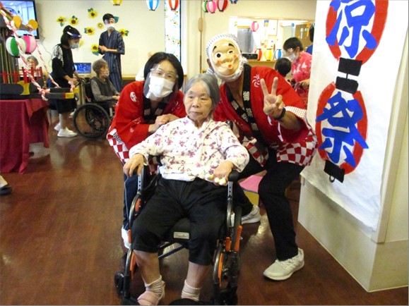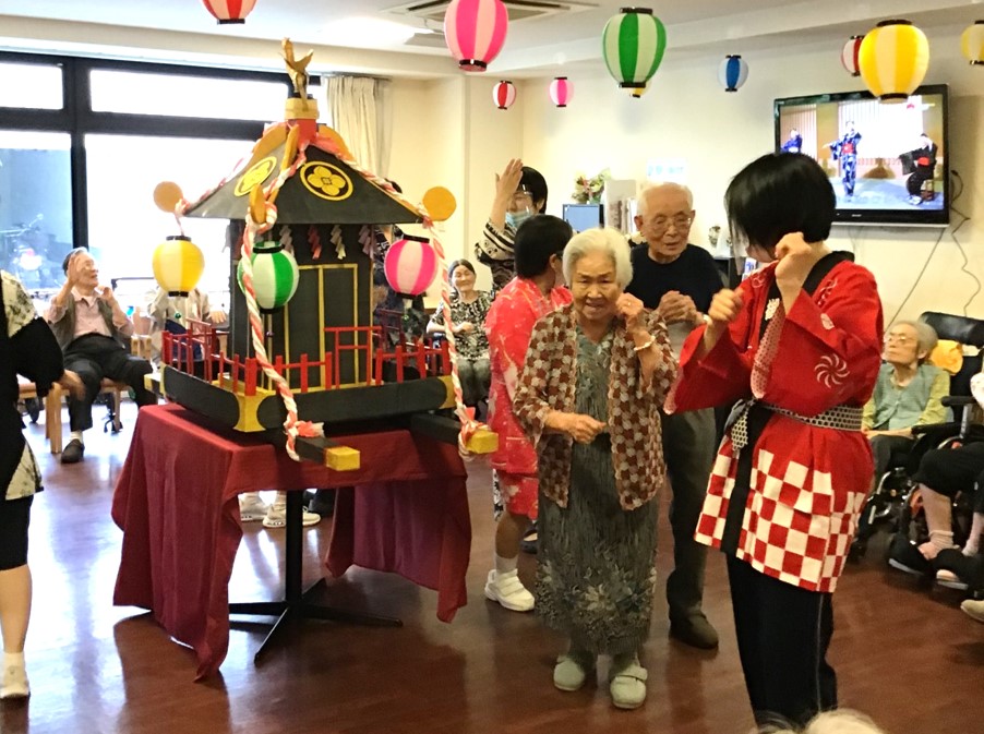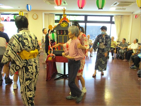 お次は盆踊りです。この日の為に、普段のレクリエーションの時間で踊りの練習を積み重ねてきました。