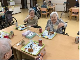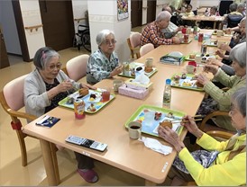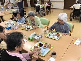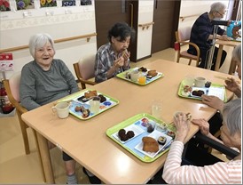 皆さま職員と一緒に一品ずつトレーに載せ、お席につきました順に召し上がって頂いております。