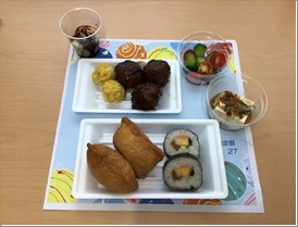 メニューは「太巻き」「稲荷寿司」「つくね串」「とうもろこしの摘まみ揚げ」「きゅうりの浅漬けとトマト」