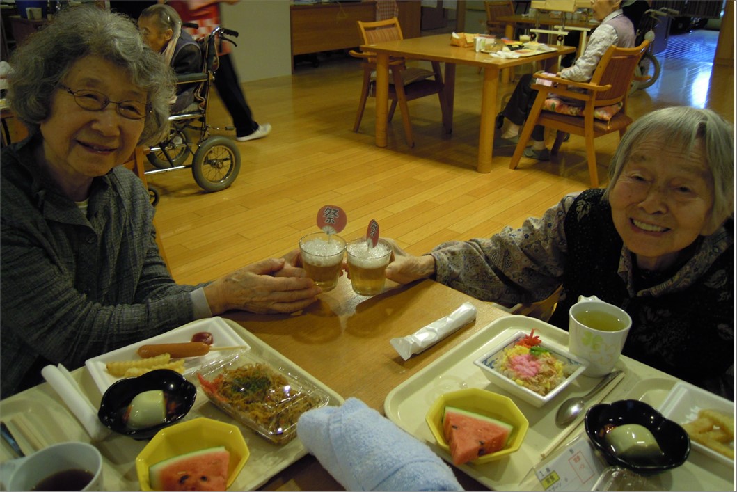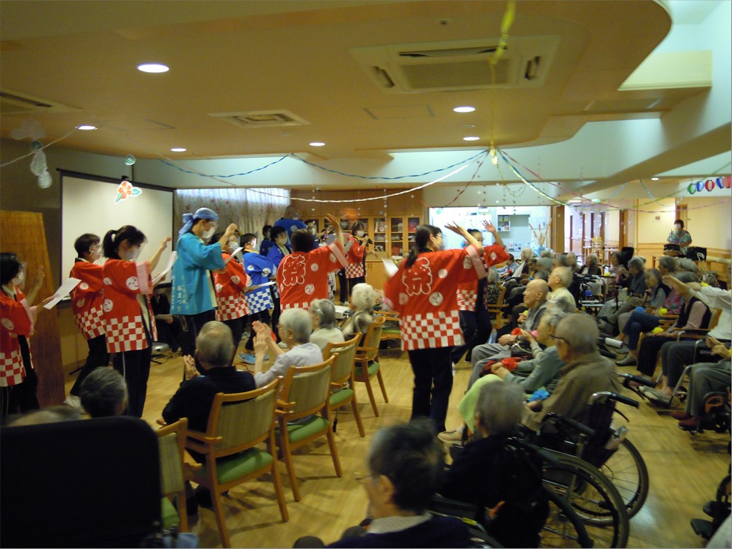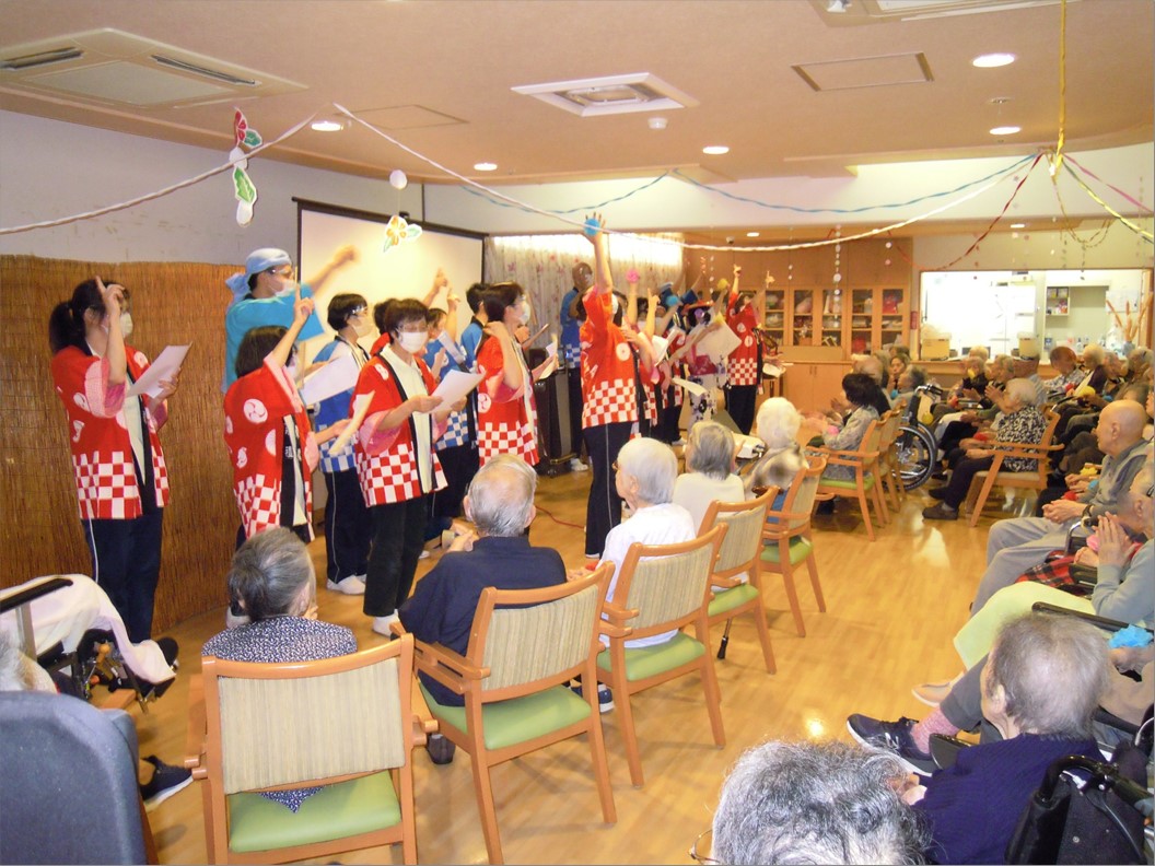 「たまや~」の掛け声と、たくさんの拍手。映像ではありましたが久しぶりに見る打ち上げ花火にご入居者様も職員も酔いしれてしまいました。