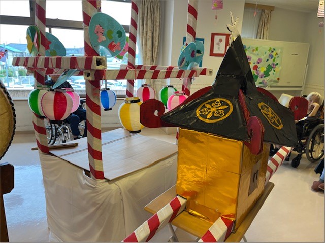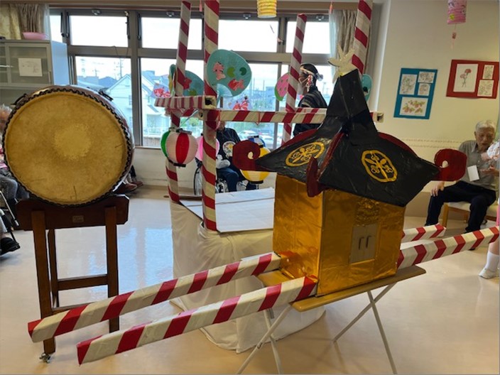 盆踊り前には、ご入居者様が作成してくださったお神輿をみんなで担ぎました!櫓も手作りです!!