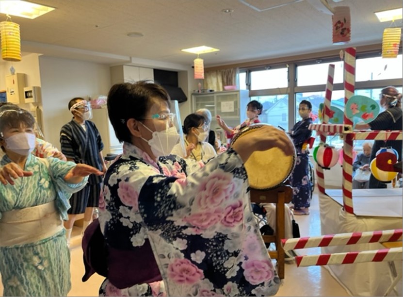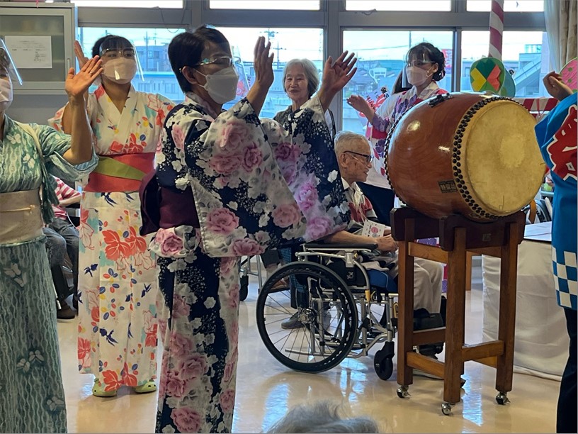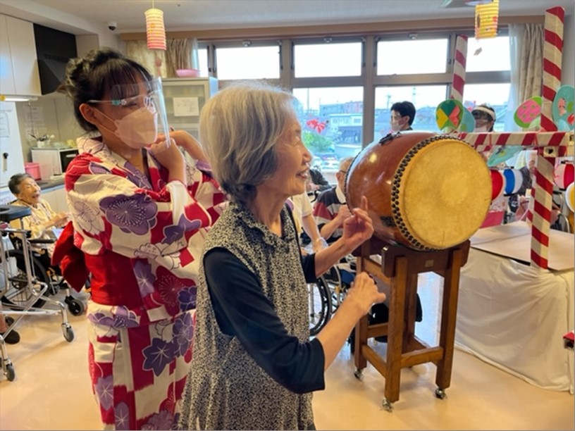 「私も踊りたい!!」と、参加して下さるご入居者様も。「太鼓叩きたい!!」と、参加して下さるご入居者様も。