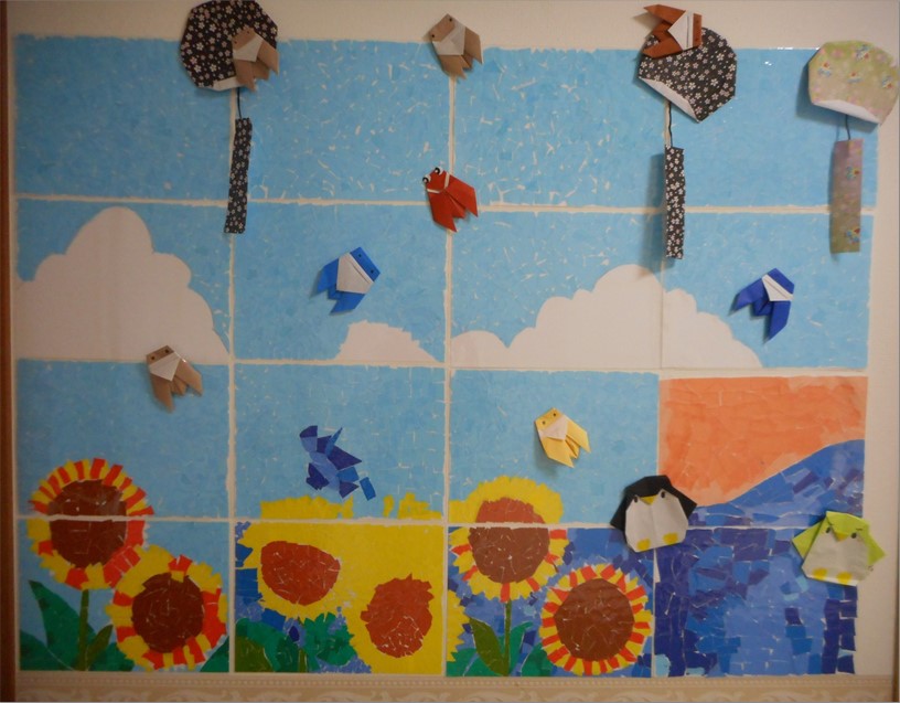 ひまわりと海と、青空には入道雲!ちぎり絵貼りつけの合間に、折り紙で蝉や風鈴やペンギンなど夏らしい?作品も折っていただき、壁画をデコレーションしました。