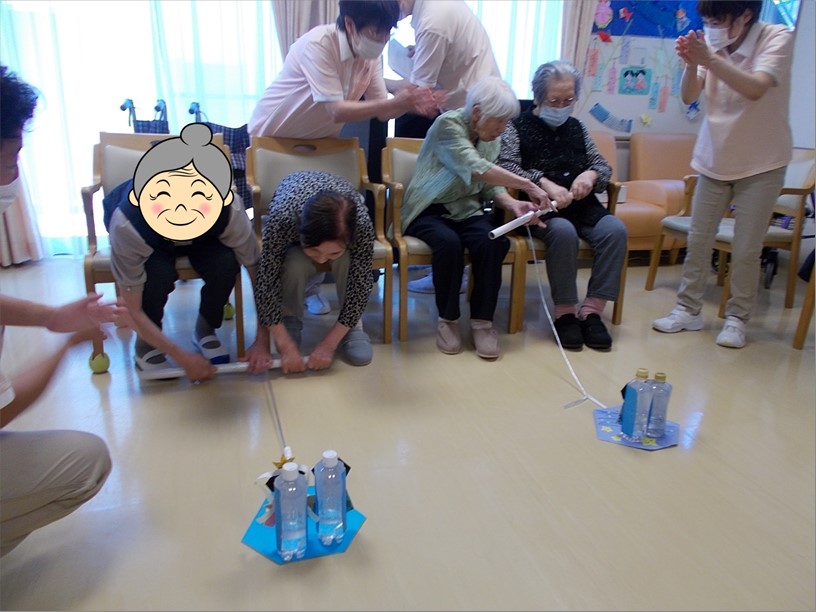 途中で人形が倒れたら、職員が人形をボード上に復帰させ、ゴールを目指します。ご入居者様の応援もあり、糸巻きゲームは盛大に盛り上がりました!