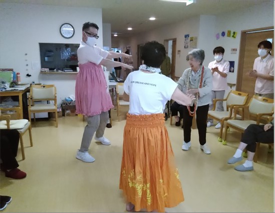 衣装や装飾も用意され、ご入居者様と職員が一緒になって踊りました。時間の経過とともに、踊りに参加されるご入居者様が増えていき、会場は更に盛り上がりました!