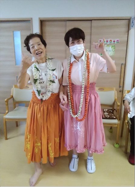 糸巻ゲームも盛り上がりましたが、その後、あるご入居者様からのご提案で、フラダンスパーティーが開催されました!!