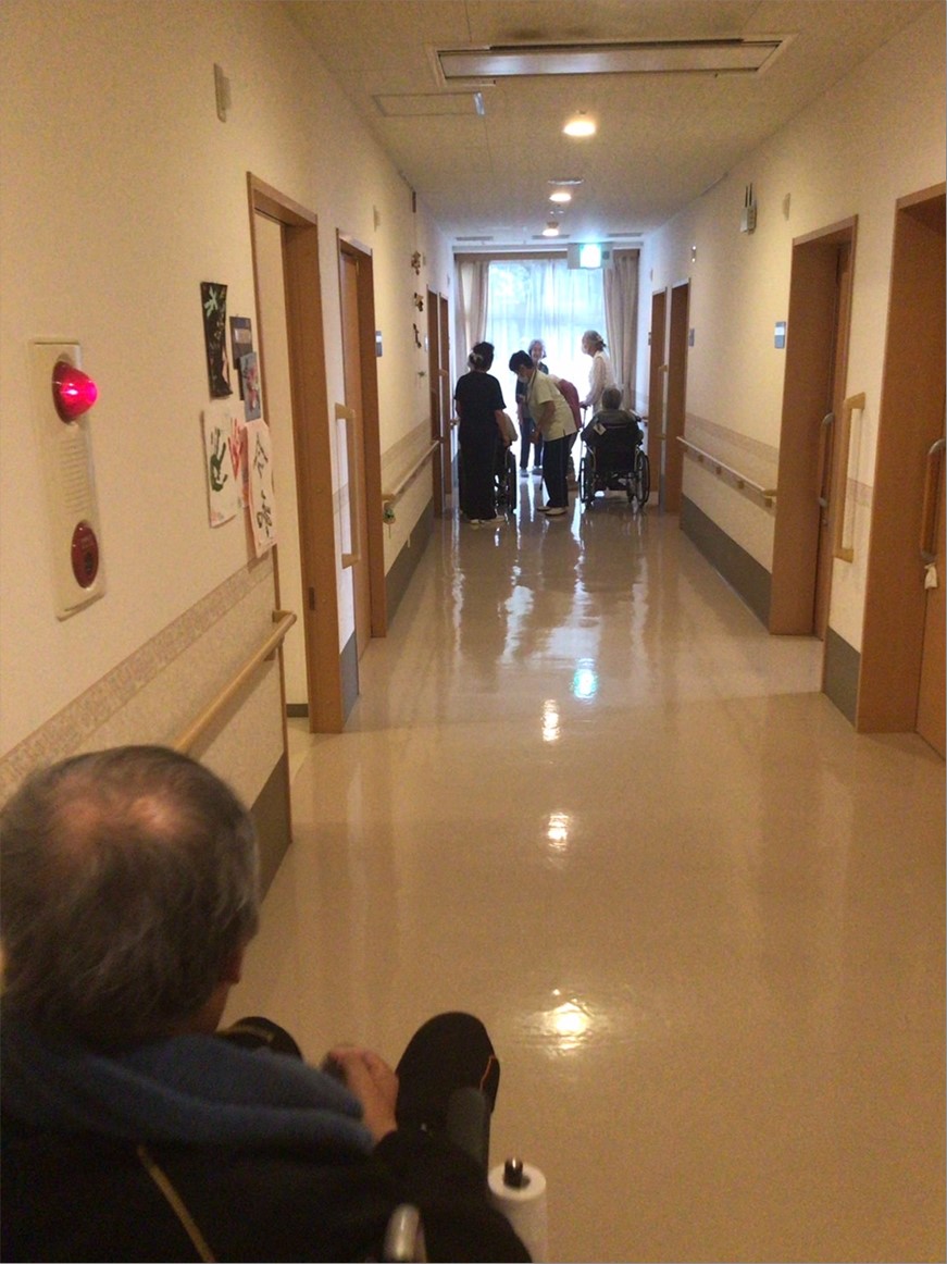 大きな声で「火事だ~。」とフロア、廊下に声が響き渡り、ご自分で歩ける方、車椅子でも自走が出来る方はお手伝いさせていただく方は、職員が誘導しました。