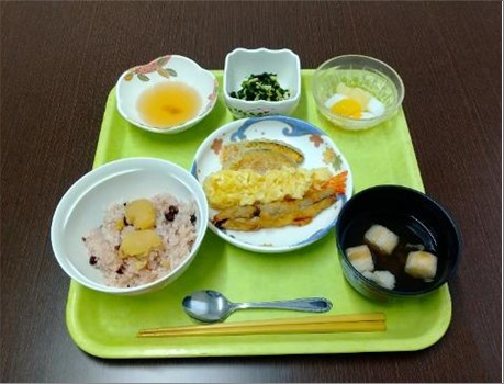 お昼ご飯に「お赤飯(栗付き)」「すまし汁」「かぼちゃ、ナス、海老の天ぷら」「たまごの錦糸和え」「デザート」とボリュームたっぷりで、皆さまにも喜んで頂いております。