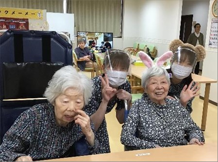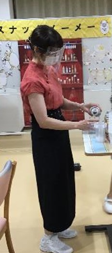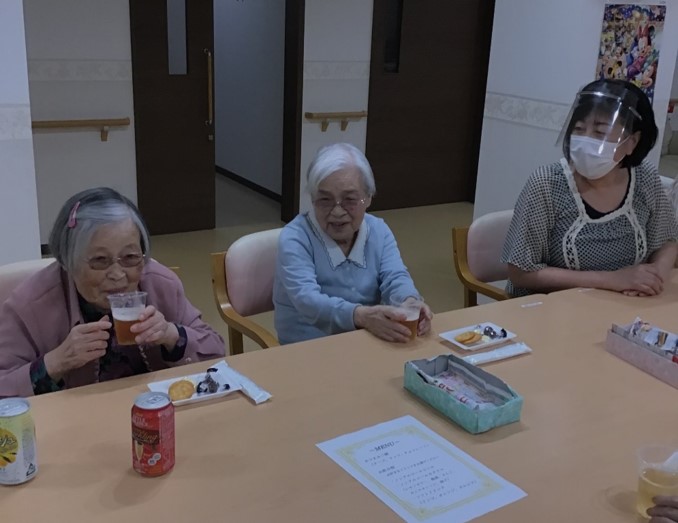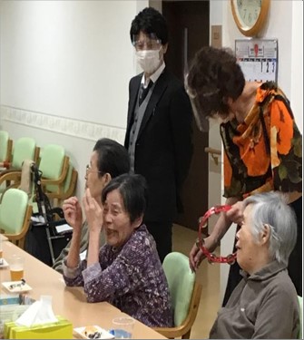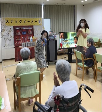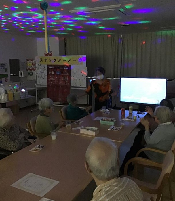 スナックの店名は「メーメー」(羊の鳴き声)、職員がお店のママになりきり、お飲み物とおつまみをご提供しながらの談笑やデュエット、また毎日顔を合わせている職員のいつもと違う雰囲気(衣装)を楽しんで頂きました。