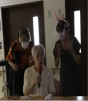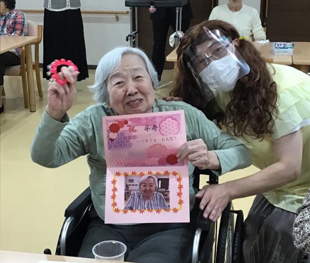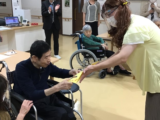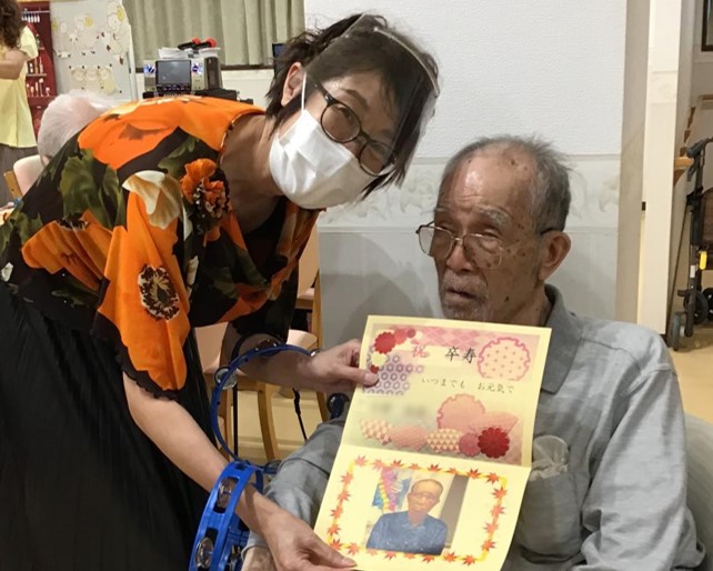 カラオケがひと段落したところで、年祝いのカードの贈呈を行わせて頂き、最後は職員と一緒に記念撮影。