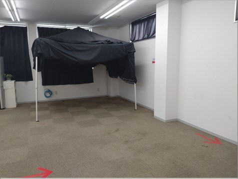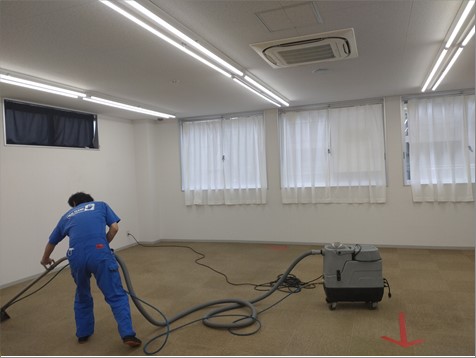 清掃業者の皆さまが油圧マシンなどを一つ一つ丁寧に持ち上げて移動したあとに、丁寧にカーペットの洗浄を行ってくださいました。